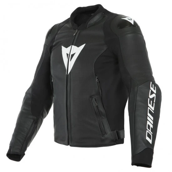 Sports jacket in perforated cowhide. Offering an athletic fit, it features interchangeable aluminum plates on the shoulders, Pro Armor protectors at the shoulders, and composite protectors at the elbows.