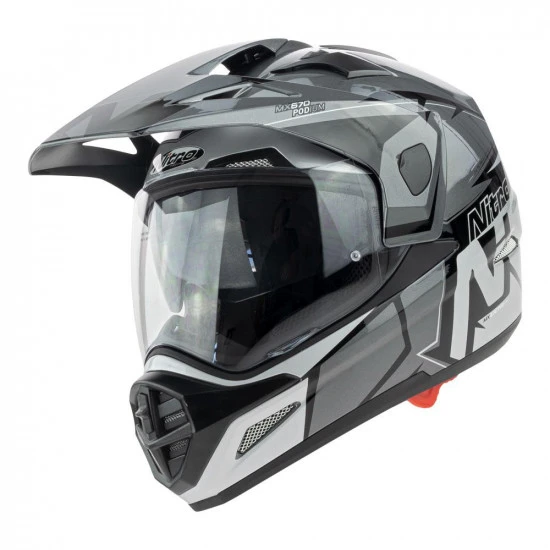 Tailored for adventure riders looking to travel distances in comfort, technology from Nitro’s F350 range and the MX620 motocross helmet combine to make the MX 670. An MX multi-poly tech construction shell features a peak and visor, which uses Nitro’s scratch-proof coating. There are adjustable chin bar and brow vents, plus rear exhaust vents. The comfort lining is removable and washable with cheek pad inserts, while fastening is complete with a micrometric buckle.