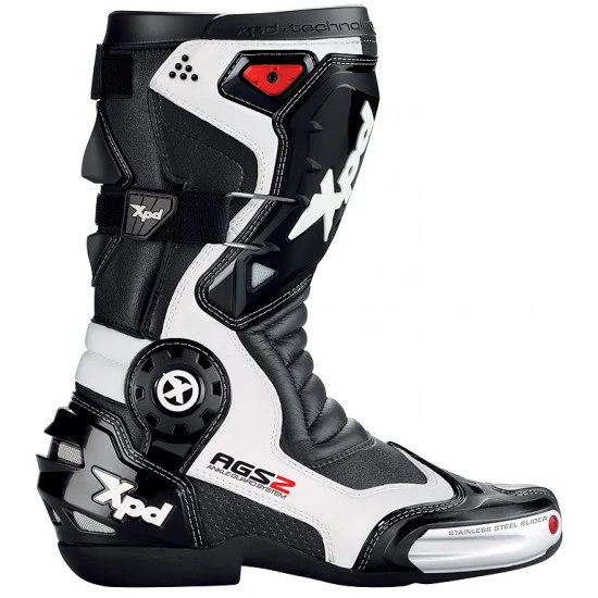 They are the latest generation of motorcycle racing boots from XPD made from leather with internal side supports and exterior adjustments to give a safer, sturdier but more comfortable fit. The new top of the range racing boot is the result of 3 years of intense research and development and features the exclusive AGS2 system (Ankle Guard System 2nd generation), becoming the boot of choice for XPD pro riders from MotoGP, Superbike, Road Racing and the Isle of Man TT.